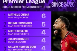 體育資訊10月26日訊 曼聯(lián)在本輪英超4-2力克布萊頓,庫尼亞遠(yuǎn)射建功。數(shù)據(jù)統(tǒng)計(jì)顯示他也是上賽季至今英超禁區(qū)外破門次數(shù)最多的球員。