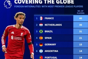 體育資訊10月27日訊 《轉(zhuǎn)會(huì)市場(chǎng)》統(tǒng)計(jì)了當(dāng)前英超的各國外援?dāng)?shù)量,法國球員多達(dá)40人。