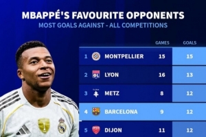 姆巴佩生涯各項賽事進(jìn)球最多球隊: