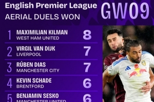 英超第9輪贏得空中對抗次數(shù)榜: