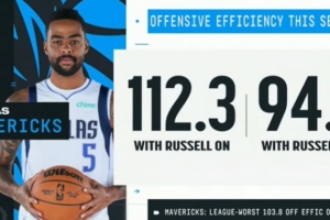 拉塞爾在場(chǎng)時(shí)獨(dú)行俠進(jìn)攻效率112.3,下場(chǎng)后為94.7;目前獨(dú)行俠進(jìn)攻效率103.8聯(lián)盟墊底