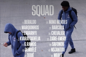前鋒:7-克瓦拉茨赫利亞、9-貢薩洛-拉莫斯、10-登貝萊、14-杜埃、29-巴爾科拉、47-恩賈恩圖、49-姆巴耶