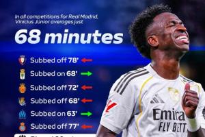 天空體育統(tǒng)計了本賽季至今維尼修斯在皇馬的出場時間,他僅有三場比賽打滿全場,至今13場比賽場均出場時間僅68分鐘。
