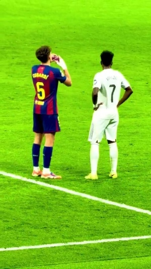 在比賽中,皇馬邊鋒維尼修斯從場(chǎng)邊拿了一瓶水走進(jìn)場(chǎng)內(nèi),口渴的巴薩后衛(wèi)庫(kù)巴西上前討水喝,巴西人沒有猶豫直接遞給了西班牙后衛(wèi)。