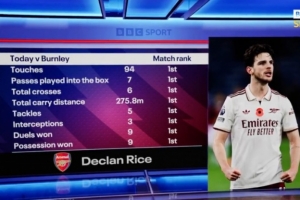 體育資訊11月2日訊 英超第10輪比賽,賴斯破門(mén),阿森納客場(chǎng)2-0擊敗伯恩利,據(jù)BBC統(tǒng)計(jì),此役賴斯觸球、搶斷、攔截等多項(xiàng)數(shù)據(jù)全場(chǎng)居首。