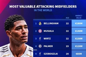 體育資訊11月2日訊 德國(guó)轉(zhuǎn)會(huì)市場(chǎng)列出了進(jìn)攻型中場(chǎng)身價(jià)排名,貝林厄姆1.8億歐居首,穆西亞拉1.4億歐次席。