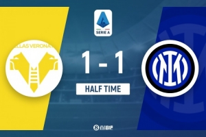 傷停補(bǔ)時(shí)2分鐘。上半場比賽結(jié)束,國際米蘭1-1維羅納。
