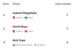 7次:加布里埃爾(阿森納)、拉亞(阿森納)