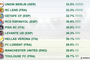 體育資訊11月4日訊 CIES統(tǒng)計(jì)了本賽季五大聯(lián)賽球隊(duì)攻防轉(zhuǎn)換階段占據(jù)進(jìn)攻總時(shí)間的比例,并列出榜單,柏林聯(lián)合由守轉(zhuǎn)攻占比33.5%居首,朗斯33.3%、赫塔費(fèi)32.7%二三位。