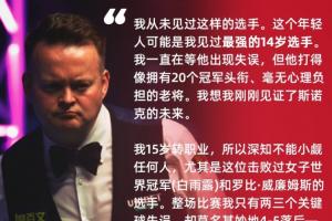 墨菲:我從未見過這樣的選手。這個年輕人可能是我見過最強(qiáng)的14歲選手。我一直在等他出現(xiàn)失誤,但他打得像擁有20個冠軍頭銜、毫無心理負(fù)擔(dān)的老將。我想我剛剛見證了斯諾克的未來。