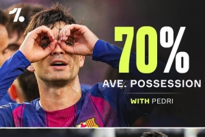 Onefootball統(tǒng)計(jì)了佩德里本賽季在場(chǎng)和缺陣時(shí)巴薩的控球率。佩德里本賽季出場(chǎng)時(shí)巴薩平均控球率70%,他缺席時(shí)巴薩平均控球率為50%,降低20%。