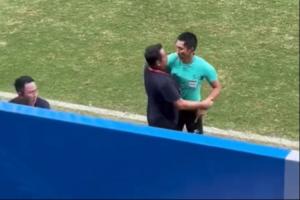 現(xiàn)場(chǎng)實(shí)拍視頻顯示,馬寧準(zhǔn)備向云南隊(duì)替補(bǔ)席的人員出示黃牌,隨后見(jiàn)到被出示黃牌的人員繼續(xù)抗議裁判,迅速跑到場(chǎng)邊。云南隊(duì)主教練立即試圖拉住馬寧,但馬寧最終還是出示紅牌將云南替補(bǔ)席上的工作人員紅牌罰下。
