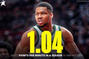 此役過后,雄鹿當(dāng)家球星揚尼斯·阿德托昆博本賽季場均得分上漲至33.8分,場均出場時間為32.3分鐘,他上場每分鐘能得到1.04分,追平了NBA歷史記錄!