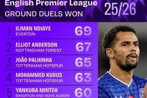 體育資訊11月11日訊 英超聯(lián)賽已經(jīng)進(jìn)行了11輪,squakwa也統(tǒng)計(jì)了本賽季英超地面成功對抗次數(shù),埃弗頓前鋒恩迪亞耶居首。