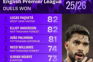 體育資訊11月11日訊 英超聯(lián)賽已經(jīng)進(jìn)行了11輪,squakwa也統(tǒng)計了本賽季英超成功對抗次數(shù),帕奎塔、安德森、帕利尼亞分列前三。