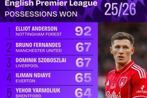 體育資訊11月11日訊 英超聯(lián)賽已經(jīng)進(jìn)行了11輪,squakwa也統(tǒng)計了本賽季英超贏得球權(quán)次數(shù),埃利奧特-安德森斷崖領(lǐng)跑。