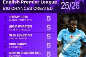 本賽季英超創(chuàng)造重大機會榜: