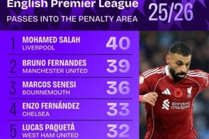 本賽季英超傳球入禁區(qū)次數(shù)榜: