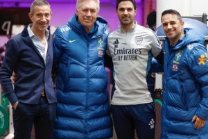 巴西隊在阿森納基地進行訓練,安切洛蒂訓練之前與阿爾特塔合影,巴西隊社媒曬出照片。