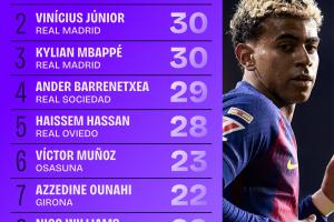 體育資訊11月12日訊 巴薩亞馬爾、皇馬的姆巴佩和維尼修斯,他們在過人突破方面,都有著非凡的天賦。在2025-26賽季西甲聯(lián)賽中,據(jù)Squawka數(shù)據(jù)統(tǒng)計,亞馬爾在過人次數(shù)排行榜單居首。