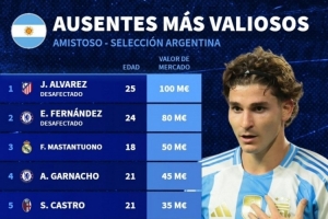 體育資訊11月12日訊 德國轉(zhuǎn)會市場統(tǒng)計了缺席本期阿根廷隊球員的身價,并列出榜單,阿爾瓦雷斯1億歐居首,恩佐-費爾南德斯8000萬歐次席。