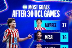 體育資訊11月12日訊 歐冠官方統(tǒng)計了阿根廷球員前30場歐冠比賽的進(jìn)球數(shù)量,并列出榜單,阿爾瓦雷斯17球居首,梅西16球次席。