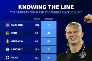 體育資訊11月12日訊 德國轉會市場統(tǒng)計了2022-2023賽季以來頂級前鋒(中鋒)在聯(lián)賽中的越位次數,哈蘭德18次最少,C羅143次最多。
