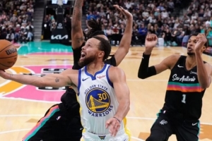 上半場卡斯?fàn)柌煌9魩炖?,庫里還以內(nèi)切,15分。下半場開始,馬刺路徑依賴,瓦塞爾和巴恩斯追打庫里,但庫里做了個(gè)動(dòng)搖馬刺根本的事: