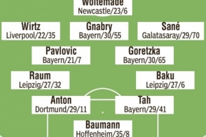 后衛(wèi):勞姆(萊比錫)、安東(多特)、若納坦·塔(拜仁)、巴庫(萊比錫)