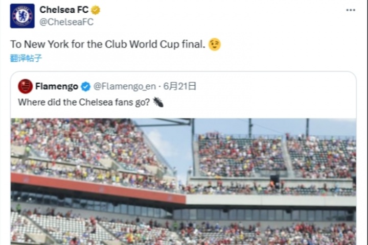體育資訊07月10日訊 切爾西2-0戰(zhàn)勝弗魯米嫩塞晉級世俱杯決賽,藍軍社媒今天發(fā)文回擊了弗拉門戈。