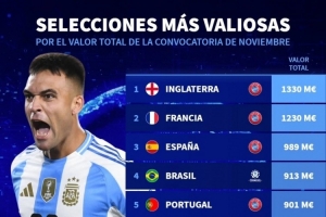 體育資訊11月15日訊 德國轉(zhuǎn)會市場統(tǒng)計了11月國際比賽日各國家隊的身價,并列出榜單,英格蘭、法國、西班牙前三,阿根廷排在第九位。