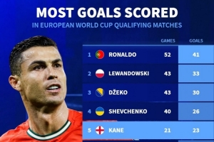 體育資訊11月17日訊 德國轉(zhuǎn)會(huì)市場(chǎng)列出了歐洲世預(yù)賽歷史射手榜,C羅41球居首,萊萬33球次席,哈蘭德21球排在第7位。