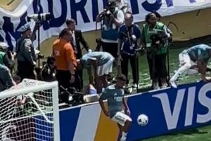 比賽開始之前,一名志愿者因高溫中暑,姆巴佩在場(chǎng)邊為其提供幫助。