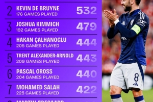 2、德布勞內(nèi):176場(chǎng)創(chuàng)造532次機(jī)會(huì)