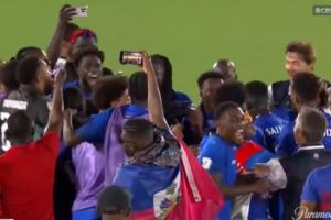 在比賽結(jié)束后,海地球員圍在一起等待哥斯達黎加vs洪都拉斯的結(jié)果。在哥斯達黎加vs洪都拉斯比賽結(jié)束后,海地球員瘋狂慶祝。