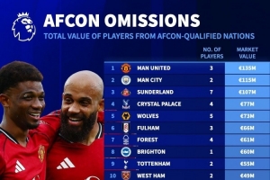 英超各隊(duì)晉級(jí)非洲杯決賽圈球員身價(jià)排名: