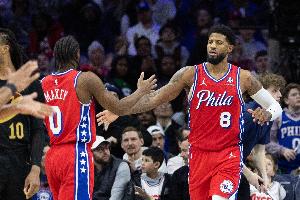 本場比賽馬克西出戰(zhàn)46分鐘,30投18中,三分15中6,罰球14中12砍下生涯新高的54分(此前是52),另有5籃板9助攻3搶斷3蓋帽;喬治打了24分鐘12投7中,三分7中4、罰球4中3拿到21分5籃板3助攻2搶斷。