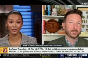 體育資訊11月22日訊 今天的《NBA Today》節(jié)目,主持人Malika Andrews連線了自己的老公、湖人隨隊記者Dave McMenamin,聊到了詹姆斯復(fù)出后的安排。