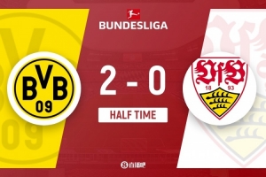 傷停補(bǔ)時(shí)3分鐘。上半場(chǎng)比賽結(jié)束,多特2-0斯圖加特。