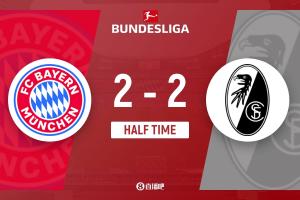 上半場(chǎng)傷停補(bǔ)時(shí)3分鐘,半場(chǎng)結(jié)束,拜仁暫2-2弗賴(lài)堡。