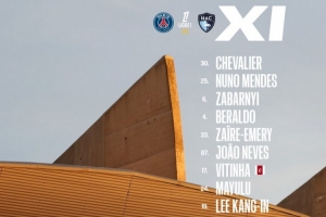 巴黎首發(fā):30-舍瓦利耶、25-努諾-門德斯、6-扎巴爾尼、4-貝拉爾多、33-扎伊爾·埃梅里、87-若昂·內(nèi)維斯、17-維蒂尼亞、24-馬尤盧、19-李剛?cè)省?-貢薩洛·拉莫斯、49-姆巴耶
