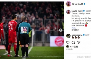 伊藤洋輝賽后在社交媒體上寫道:“這238天,都是為了這一刻。 對(duì)我來說這真的是一個(gè)特別的日子。 感謝所有支持過我的人??MIA SAN MIA??”