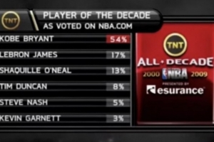科比自媒體Kobe Bryant Stories & Motivation則曬出了一則多年前TNT電視直播畫面,內(nèi)容為NBA官網(wǎng)2000-2009最佳球員投票結(jié)果,科比得票率54%高居第一,第二的詹姆斯和第三的奧尼爾合計得票率30%。