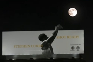 延時(shí)攝影!庫里投籃廣告牌和月亮完美角度!形成一個(gè)出手投籃弧線