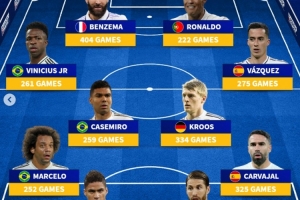 中場:維尼修斯(261場)、卡塞米羅(259場)、克羅斯(334場)、巴斯克斯(275場)
