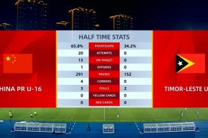 體育資訊11月24日訊 U17亞洲杯預(yù)選賽A組第二輪,中國隊半場6-0領(lǐng)先東帝汶。數(shù)據(jù)統(tǒng)計顯示,上半場形勢完全一邊倒。