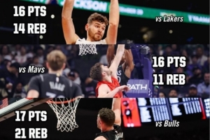 克林根出戰(zhàn)27分鐘9投5中 ,三分4中2,罰球3中2砍下14分12籃板4助攻1搶斷1蓋帽,正負(fù)值+14。