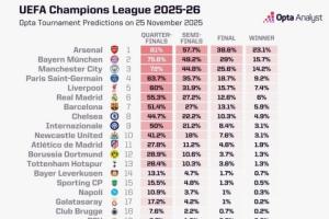 體育資訊11月25日訊 歐冠聯(lián)賽階段第5輪明日打響,Opta超算給出了最新的歐冠奪冠概率,其中阿森納以23.09%高居第一位,拜仁15.67%緊隨其后,曼城14.2%排名第三。