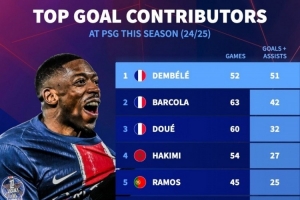 體育資訊7月11日訊 德國(guó)轉(zhuǎn)會(huì)市場(chǎng)列出了本賽季巴黎隊(duì)內(nèi)參與進(jìn)球榜,登貝萊52場(chǎng)參與51球居首,巴爾科拉參與42球次席。