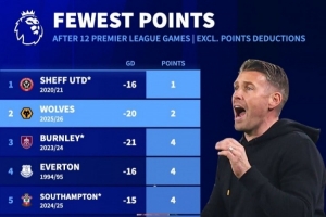 南安普頓(24/25賽季12分)、桑德蘭(05/06賽季15分)、謝菲聯(lián)(23/24賽季16分)也是此前的英超單賽季積分倒數(shù)前四。